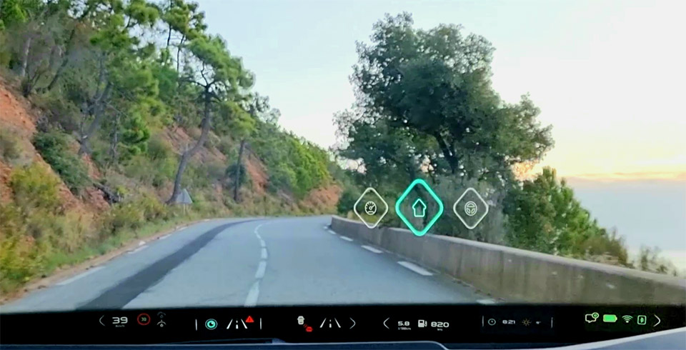 L’affichage, visible par le conducteur (même équipé de lunettes de soleil) mais aussi par l’ensemble des passagers, vise à améliorer la sécurité active en indiquant de multiples informations : vitesse, GPS avec indication, avertisseurs d’angles morts, climatisation ainsi que d’autres informations en temps réel de type distances de sécurité, présence de cyclistes… sans oublier la possibilité de projeter Waze et Google sur le pare-brise.