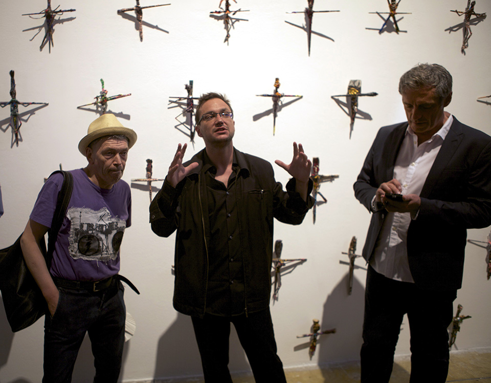 1 – Numa Hambursin, aux côtés de l’artiste Robert Combas (à gauche) et Philippe Saurel, ex-maire de Montpellier. Parmi les crucifix, au Carré St-Anne, en 2014, la photo rappelle combien la politique culturelle peut s’avérer cruelle.