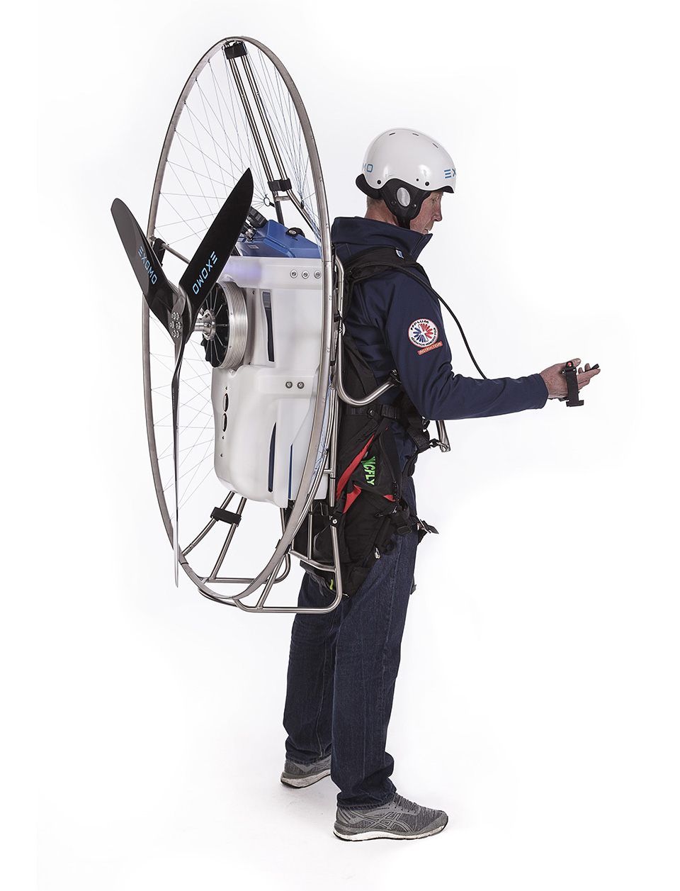 « À la différence des précédents modèles, cette nouvelle version de l’Exomo (34 kg) est dotée d’une motorisation plug and play avec une batterie démontable en quelques secondes, une autonomie d’une heure de vol (à 40 km/h) mais également d’une interface pour l’aide au pilotage », détaille George Blottin.
