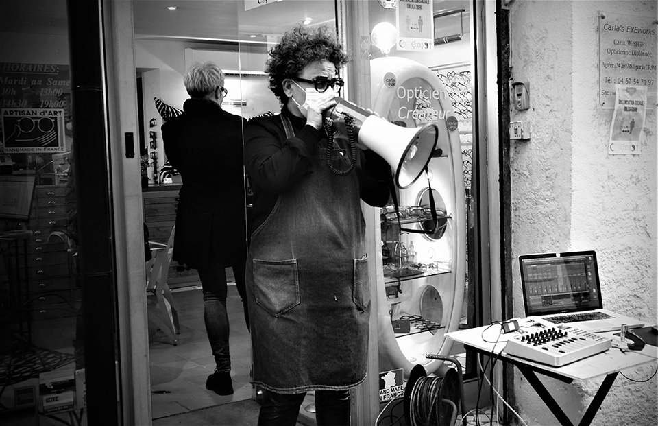 Au 7 rue du Petit Saint-Jean, quelques palettes en guise de scène posées contre la vitrine du show-room Carla’s eyeworks, un rideau rouge… il n’en faut pas plus pour que peintres, photographes, danseurs, musiciens ou auteurs viennent performer, dans le respect des mesures sanitaires. À l’intérieur, les artistes locaux ont également carte blanche pour investir le moindre m2. Première à s’être lancée, Karen Thomas. Installée à Montpellier, l’artiste britannique a pu dévoiler ses œuvres figuratives expressionnistes à l’esprit pop vintage matchant parfaitement avec les collections de Carla. Se sont produits successivement Philippe Loubat, peintre local incontournable, accompagné musicalement par MOI, Patrice Barthes dont les trois performances avec Braquage sonore ont été très remarquées, Claudia Montanari et ses photos interactives ou encore Sanaa Mejjadi avec ses travaux en peinture et techniques mixtes.