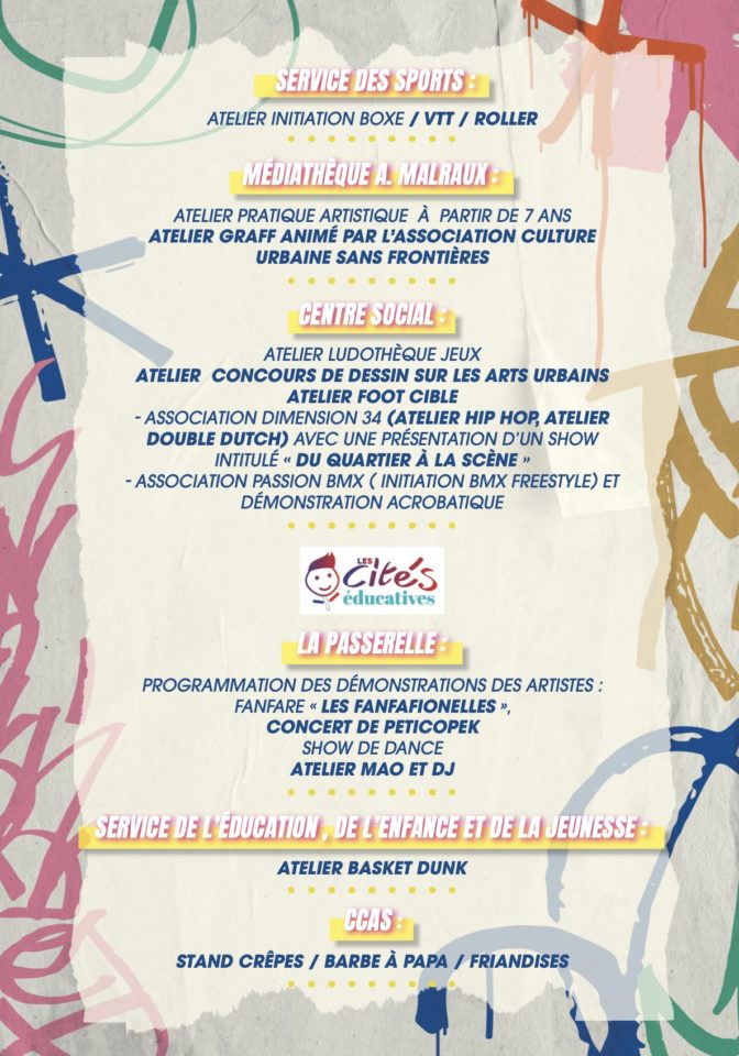 Sous l’impulsion du CCAS de la Ville et de Sète Agglopôle Méditerranée, avec le soutien des associations locales, c’est tout un quartier qui va s’animer, bouger, vivre, de la place Seinchole à la médiathèque André-Malraux, du centre social à la Passerelle. Et il y en aura pour tous les gôuts. Initiations à la boxe, au VTT, au roller, au BMX ou au basket dunk ; ateliers artistiques (graff, dessins, hip hop, double dutch, Mao et DJ…) ; spectacles (notamment un concert de Peticopek), chacun est invité à venir participer !