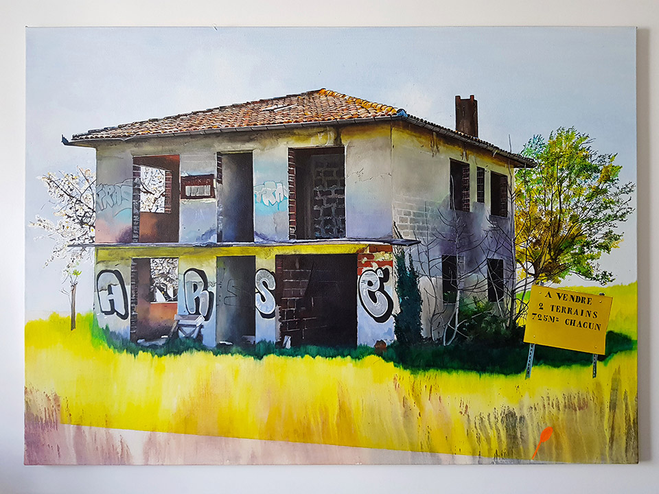 Cette rencontre artistique a donné naissance à une sorte d’alphabet composé de 14 petits formats (22×27 cm) et de quelques grands, réécrit depuis des paysages à partir d’un détail qui a marqué la jeune femme. En ressort une peinture réaliste qui met la touche finale à Bilan plasma : « Je trouve plaisant d’accrocher mes œuvres en dernier, comme une conclusion à ce parcours collectif, souligne la diplômée de l’Isdat (Institut supérieur des arts et du design de Toulouse) en rappelant que les quatre artistes ont eu plusieurs rendez-vous pour construire le projet et la scénographie. J’y retrouve le plaisir de mes déambulations, ça me plaît. » Cassandre Fournet travaille principalement l’acrylique, l’aquarelle et le crayon de papier sur des photographies qu’elle prend à l’occasion de ses voyages et de ses déambulations quotidiennes. Si les lieux saisis témoignent d’un vide et d’une finitude à venir, rendus hyperréalistes grâce à un travail de cadrage saisissant, ils semblent sortir de leur inertie au contact des couleurs vives et des coulures.