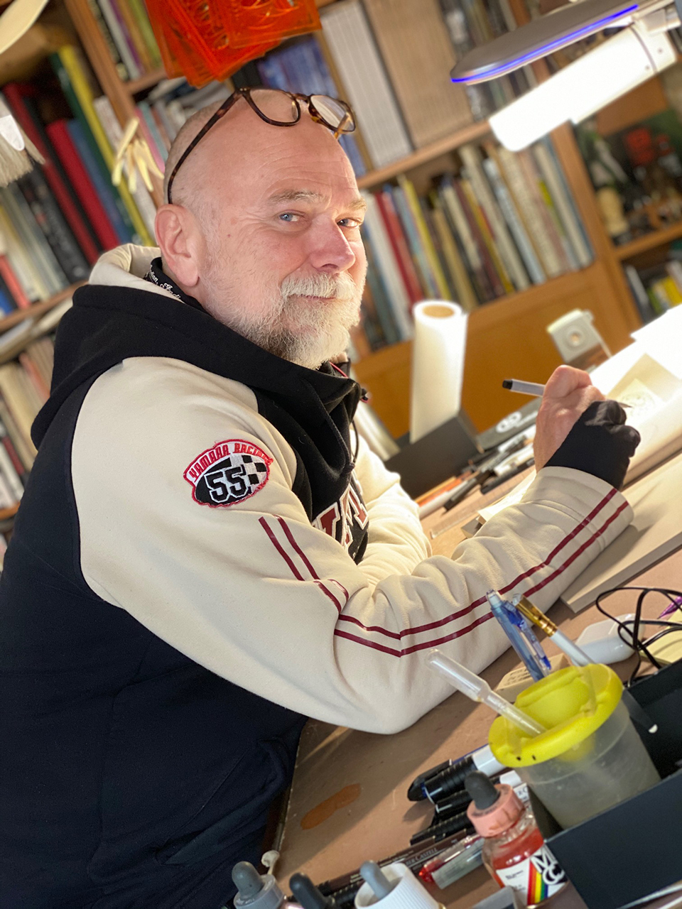 Comme tout le monde, j’en ai un peu marre d’être enfermé. Mais pour moi, ça ne change pas énormément les choses ; je bosse chez moi. Je mets un masque quand je vais chez les commerçants et quand je vais à l’atelier, de temps en temps. J’y ai une grosse partie de mon matos, mais j’essaie de réduire mes sorties quand même.